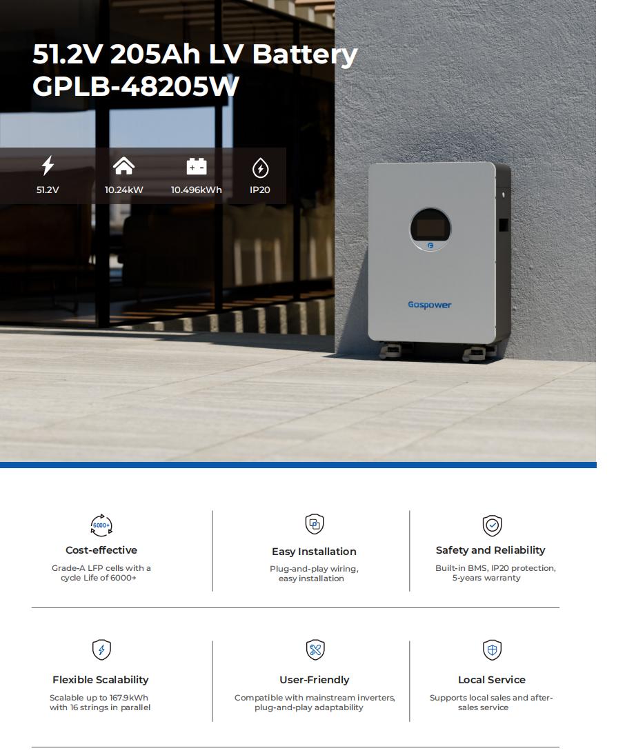 10.49kWhGospower GPLB-48205W wheeled lithium battery adopts the feature of fast installation. Up to 16 strings in parallel, providing strong scalability, which can be used in your home or small commerical scenes.
