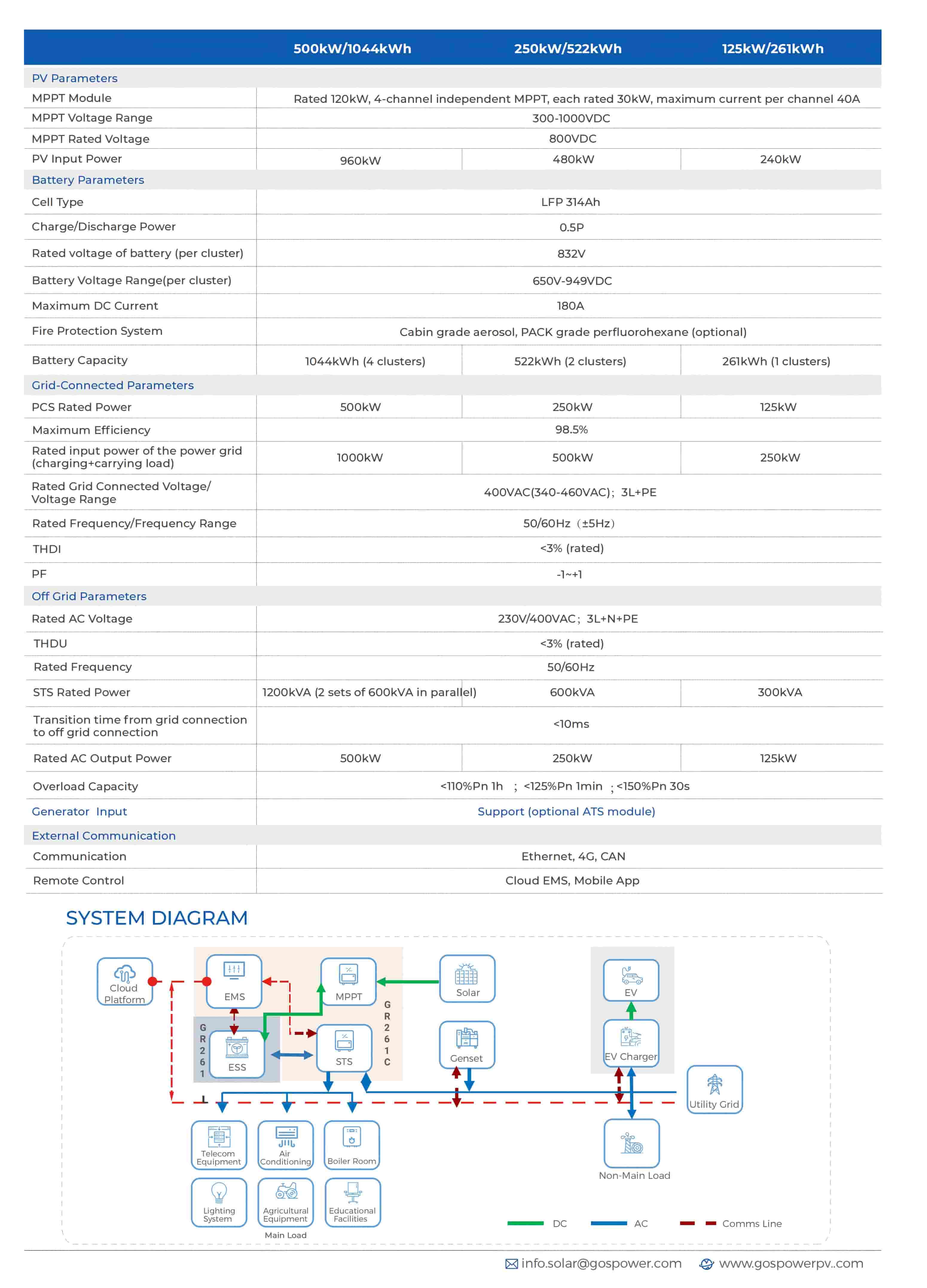 3 standard configurations: 125kW/261kWh | 250kW/522kWh | 500kW/1044kWh